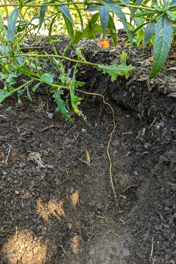 I went to pull the other enormous worthless plant out and — WHAT! lo and behold, there were two big sweet potatoes!!! Some critter had found them before me and started gnawing on them. In fact they were sticking out of the ground, chewed. Sadly, no photo. You will have to believe me.