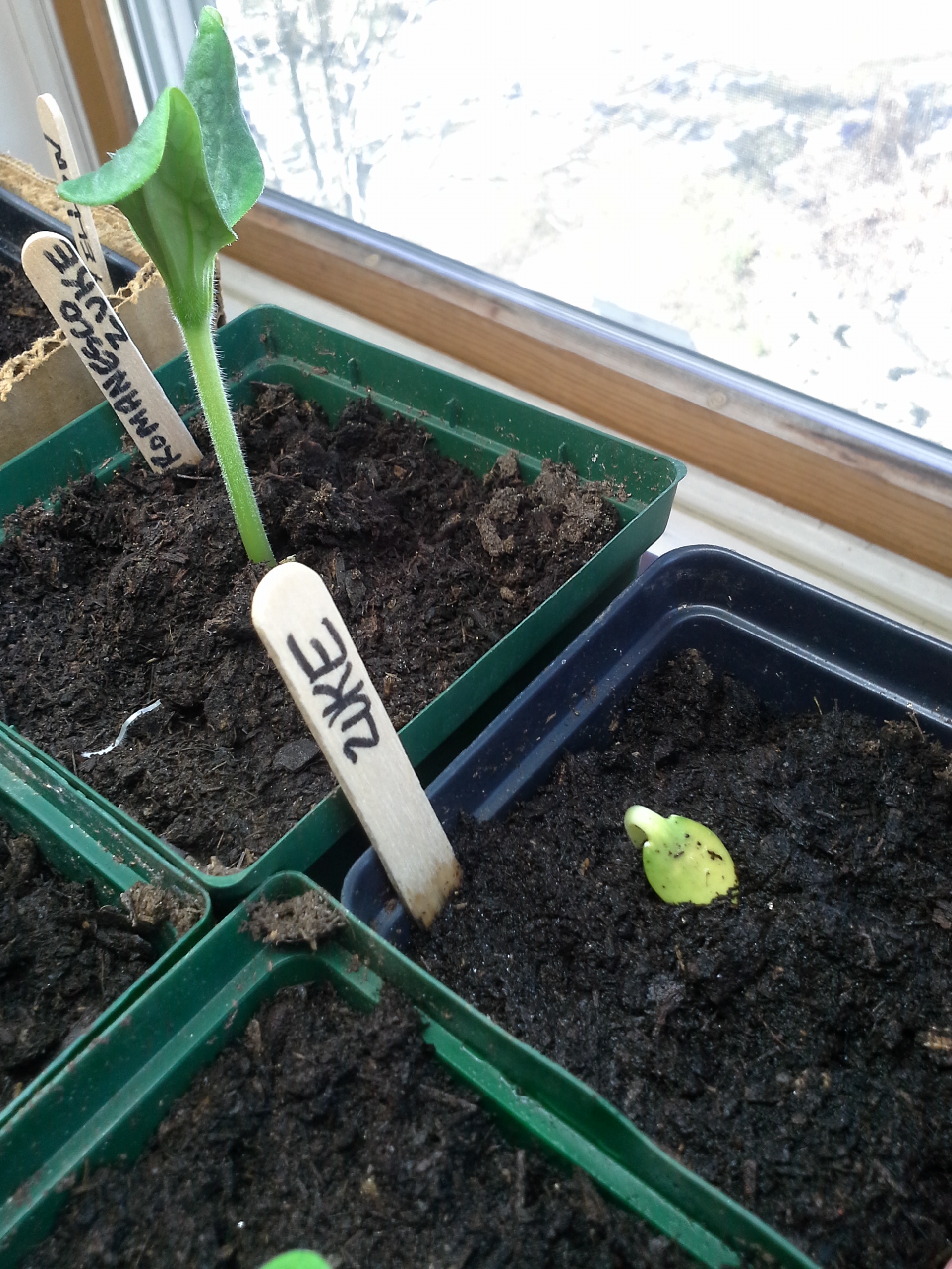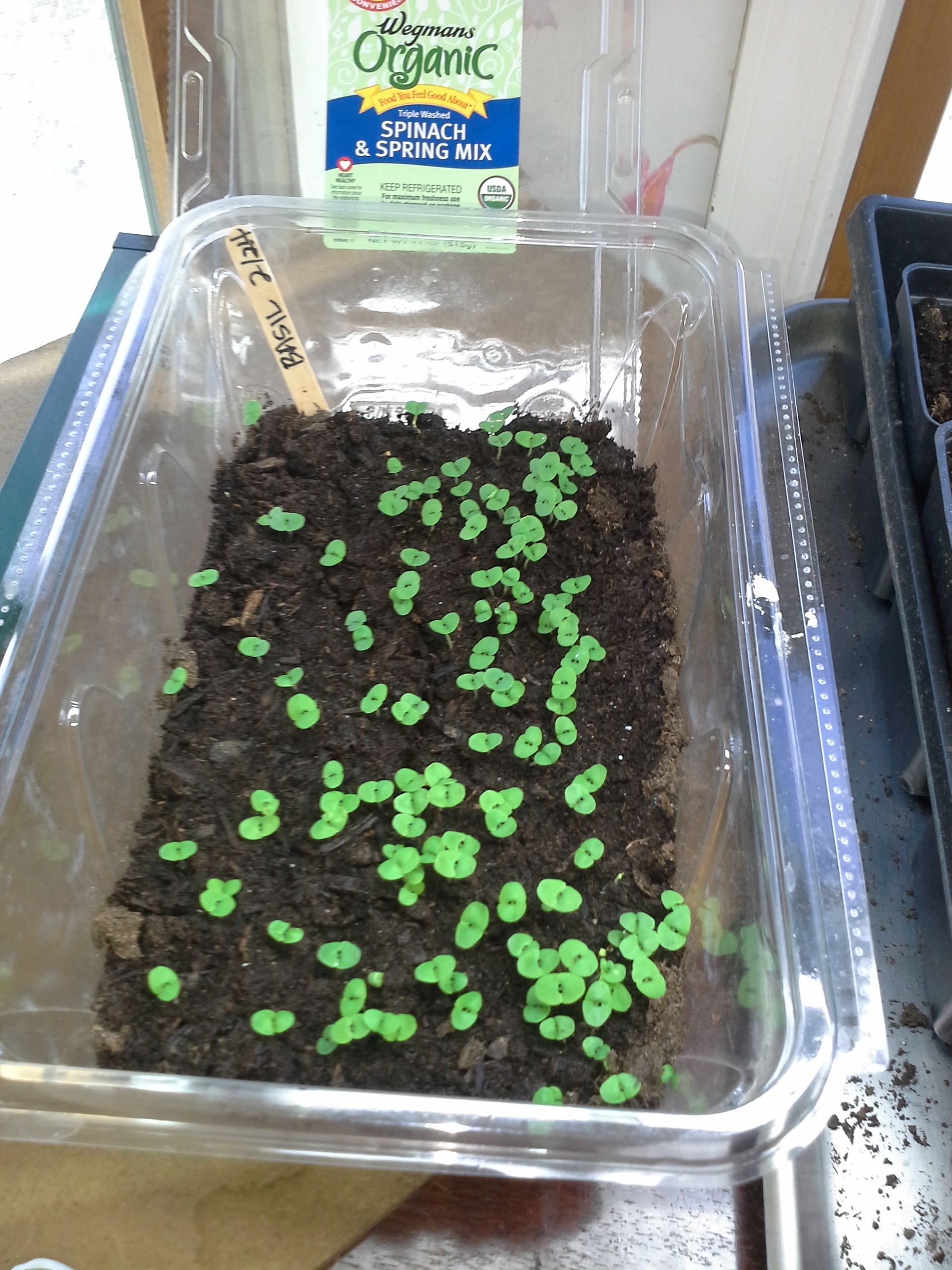 Every year I learn more about being the midwife, rather than the anguished excluded dad in this process. I have learned that I don’t need a heating pad (although it can help!), just a grow-light and/or sunny window, and patience. I have learned how important regular watering is. Last year I learned a trick for germination of difficult seeds (like flower seeds) is an old plastic salad or berry box, with the plastic snap down lids, but ventilated too. Keeps things the right amount moist, but not soggy.
